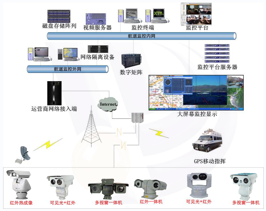 航道監(jiān)控作為數(shù)字航道中的一個組成部分,擔(dān)負(fù)著全天候?qū)崟r監(jiān)控航道上航標(biāo)運行狀態(tài)、過往船只航行狀況、航道設(shè)施安全防范的職責(zé)。采用微波/光纖通信技術(shù)、數(shù)字視頻處理技術(shù)、IP通信技術(shù)和光纖通信技術(shù)等先進的通信技術(shù)的網(wǎng)絡(luò)圖像監(jiān)控系統(tǒng)。是對數(shù)字航道的補充,可以在各種氣候及光線條件下24小時實時記錄航道現(xiàn)場情況,及時發(fā)現(xiàn)航標(biāo)狀況、船舶航行狀況、非法采砂和占用航道等現(xiàn)象,為航道暢通和大橋安全提供良好的保障。